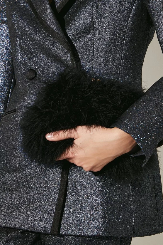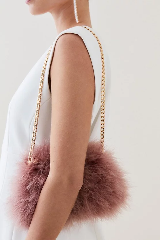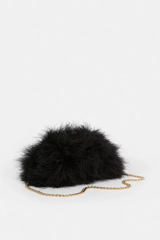Main: Feather, Lining: 100% Polyester. Frame size: 16cm. W: 18cm, H: 14cm, D: cm.4cm Strap Length:62cm.