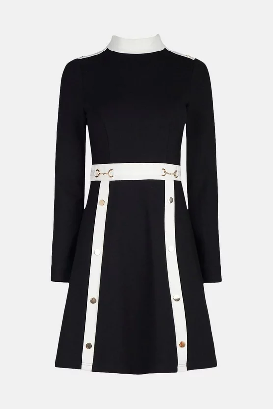 At once both preppy and polished, this neat colour-block dress shows off heritage--style snaffle trims and two rows of glossy gold-tone buttons. Its flattering high-necked fit and flared skirt show off every figure perfectly.