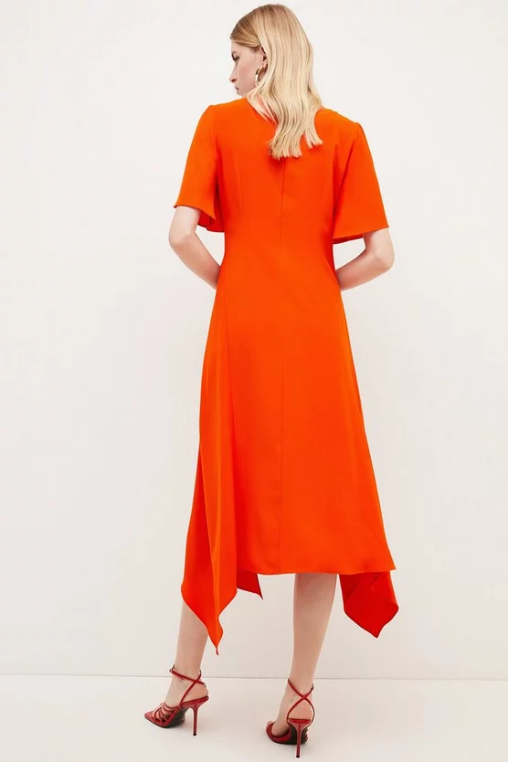 Romantic ruffles are sharpened with effortless tailoring for this dimensional midi dress. Draping the body with soft jersey for a statuesque finish, itβs defined by a frilled neckline and floaty short sleeves with split cuffs. Fitting the bodice before falling to a split skirt, pair with gold stilettos and oversized hoops for statement-making magic at summertime soirΓ©es.