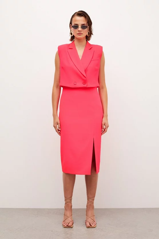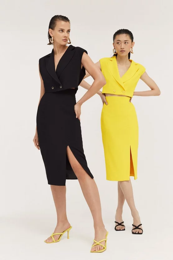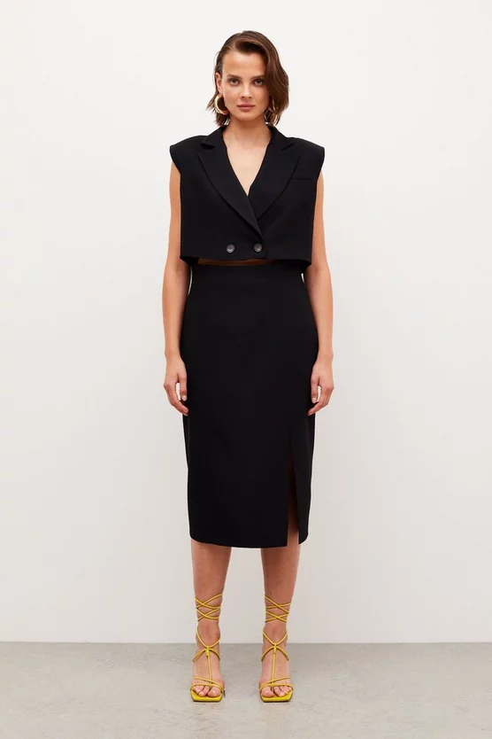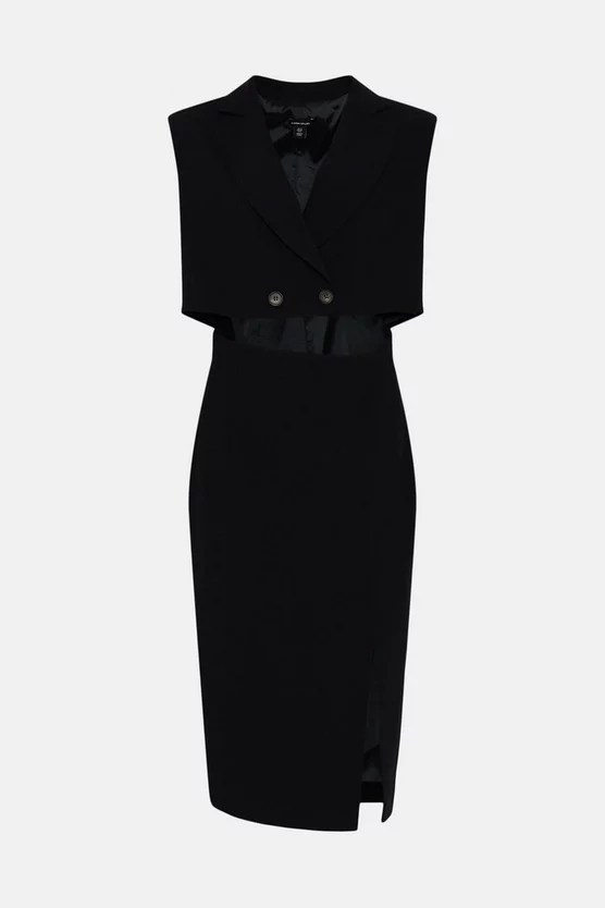 Disrupting the traditional rules of tailoring, this directional twill tux dress comprises two elegant parts ? a sleeveless blazer-style top and elegant column-cut midi skirt. Fitted with power-dressing shoulder pads and a sharp hem split, this double-breasted design champions our alluring anti-fit aesthetic.