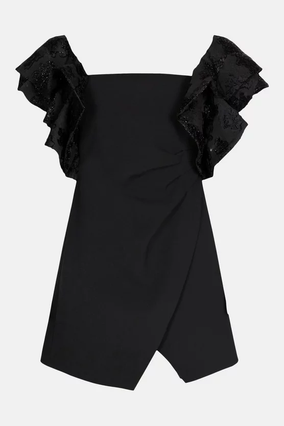 Turn up the volume in this distinctive mini dress. Dramatically defined by layered short sleeves that shimmer in the midnight hour, it has a contrasting streamlined body that skims the figure with balanced allure. A bandeau neckline, wrap-style skirt and precise split hem finish this dimensional piece. Amp it up with oversized jewels and towering platforms for a night to remember.