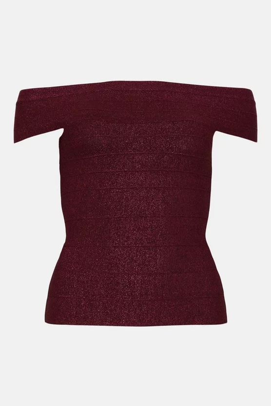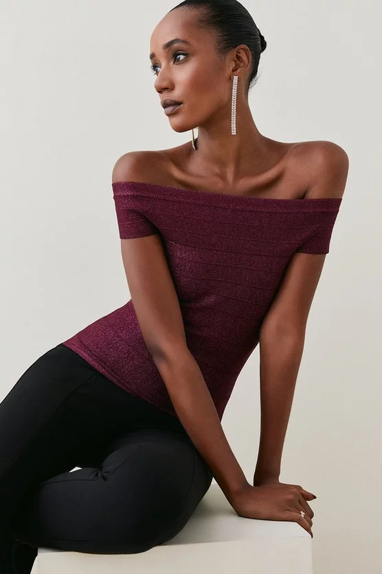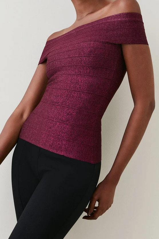 Packed with lustrous depth, this contouring Bardot top scintillates with fashion-first effect. Wrapping the form with defining bandage knit, pair with tactile leather for a considered contrast.
