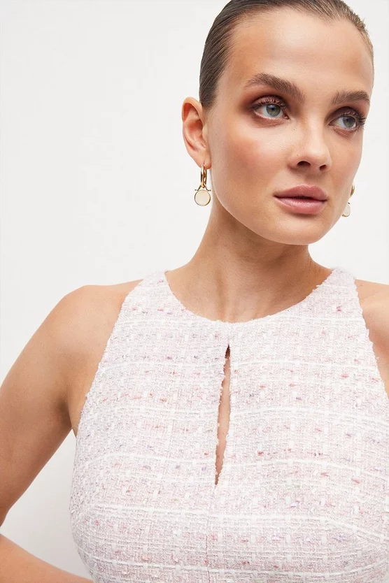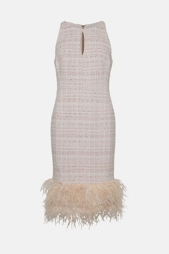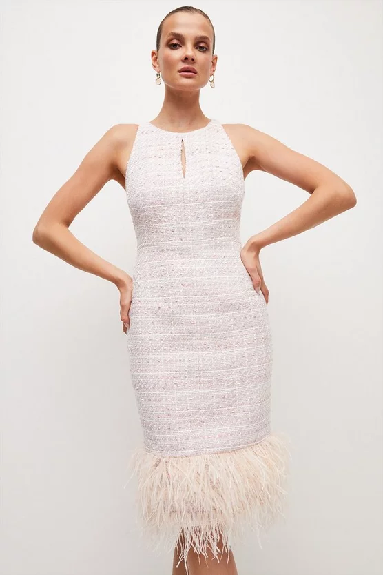 Nail the dress code in this new take on tweed. Infused with sparkling threads, this tailored cotton-blend dress catches the light as you stride. A spray of feathers flutters at the hem, drawing the eye to the elegant pencil silhouette and sleek, sleeveless cut. Finished with a teardrop cut-out to the front, this zipped piece is sure to make its mark at special soirees.
