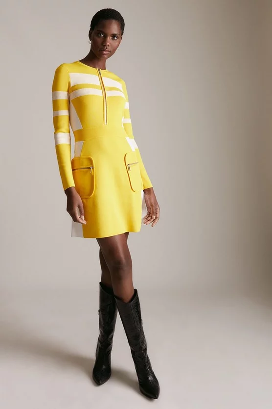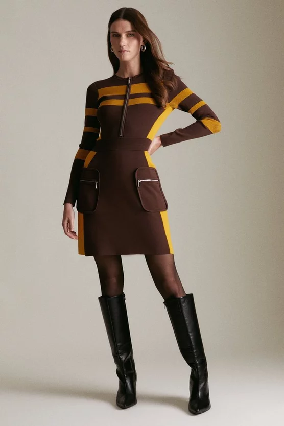 This colour-block dress is a winner when it comes to sports-luxe. Holding you into perfection, the waist is accented by a ripple-stitched belt, while carefully placed stripes and panels give interest to the A-line shape. A glossy front zipper allows you to adjust the look as you wish, while style meets function with its eye-catching zip pockets.