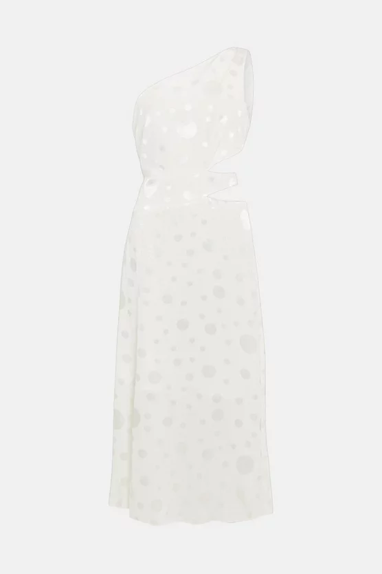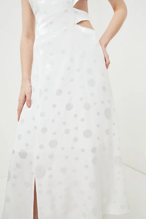 Designed for those with a playful sartorial streak, this slinky jacquard dress is adorned with tonal spots and features racy side cut-outs and an asymmetric neckline. Draping down into a swishy midi skirt, it looks gorgeous elevated with architectural earrings and metallic sandals.
