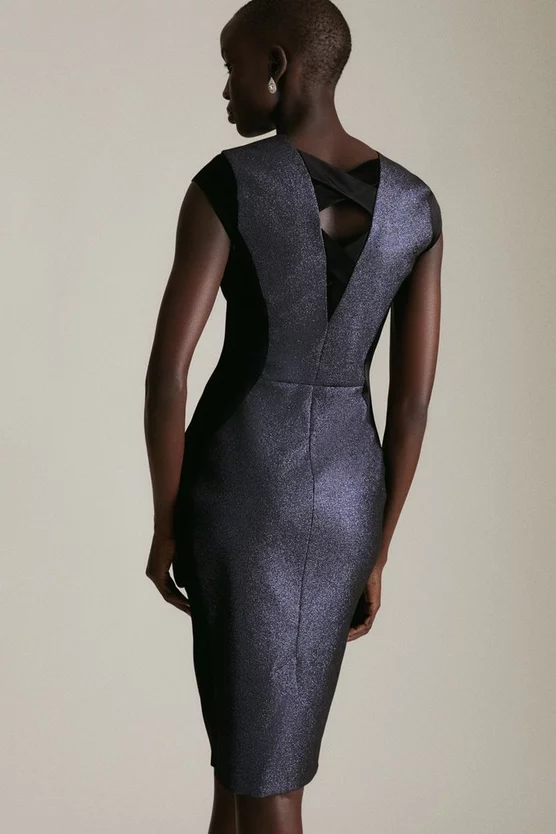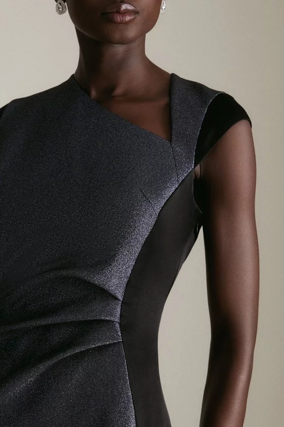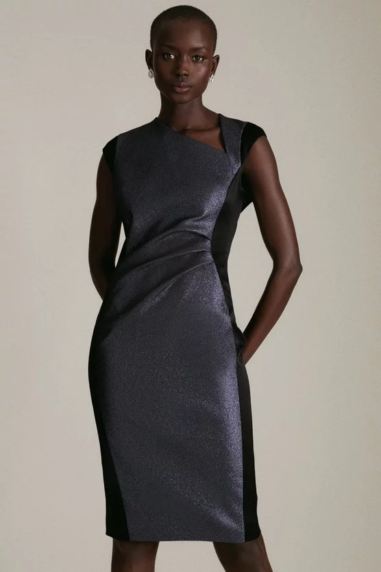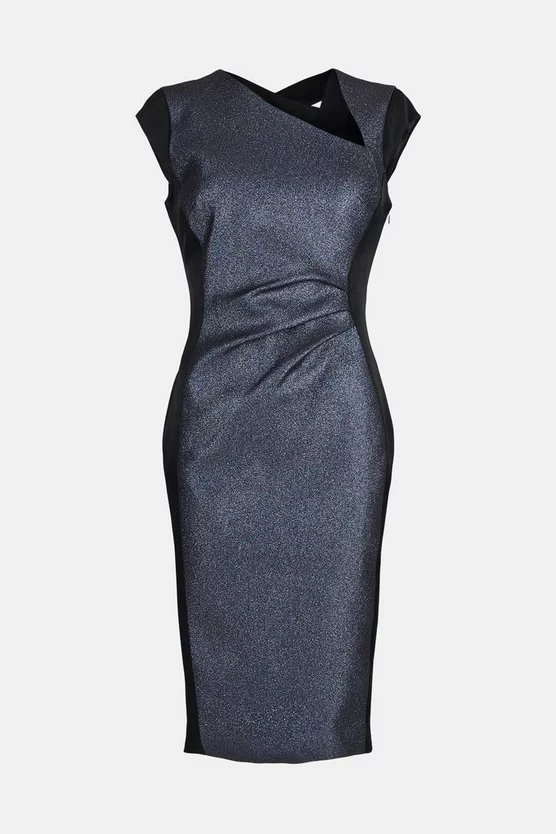 An asymmetric neckline and streamlining panels make this metallic pencil dress a key contender for your new favourite party piece. Pour yourself into this chic cap-sleeved design for a look that’s sure to get compliments.