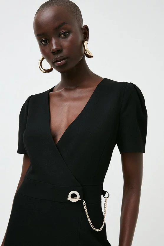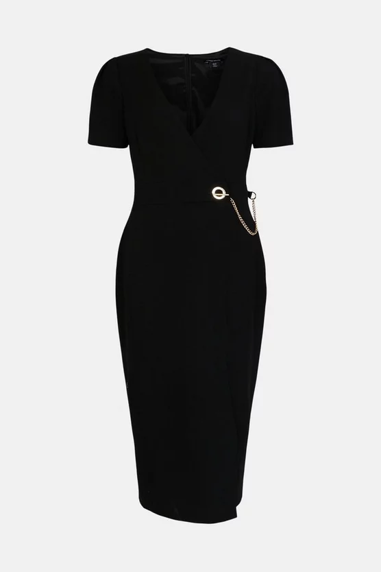 Punctuated with a polished silver chain fastening, this Structured Crepe pencil dress has an undeniably edgy finish. Detailed with softly puffed sleeves, a plunging wrap neckline and a seductive hem split, it lends dressed-up glamour to special occasions.