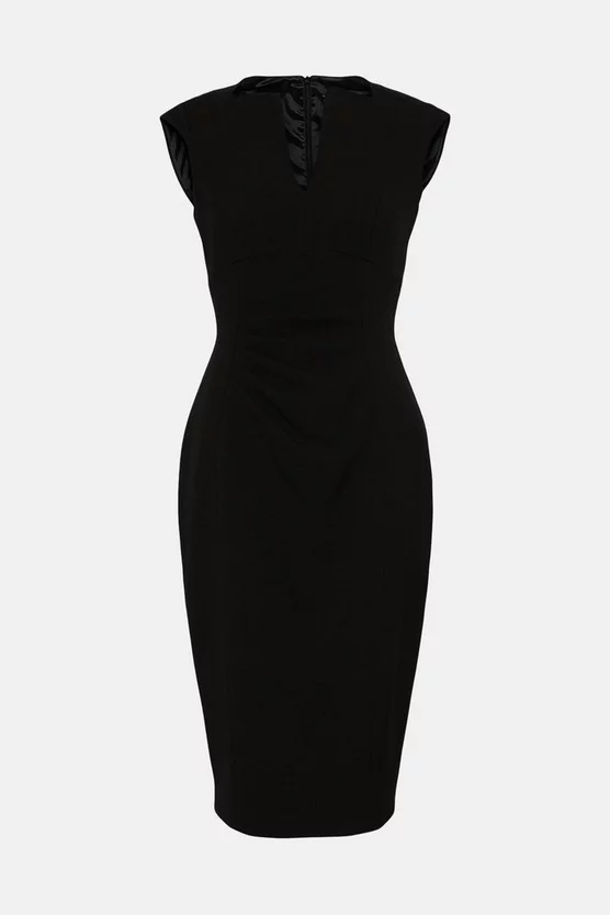 Statuesque in its Structured Crepe composition, this midi dress appears with polished reverence. Framed by the exaggerated depth of a notched neckline, it has artful draping to the bodice for a dimensional finish.