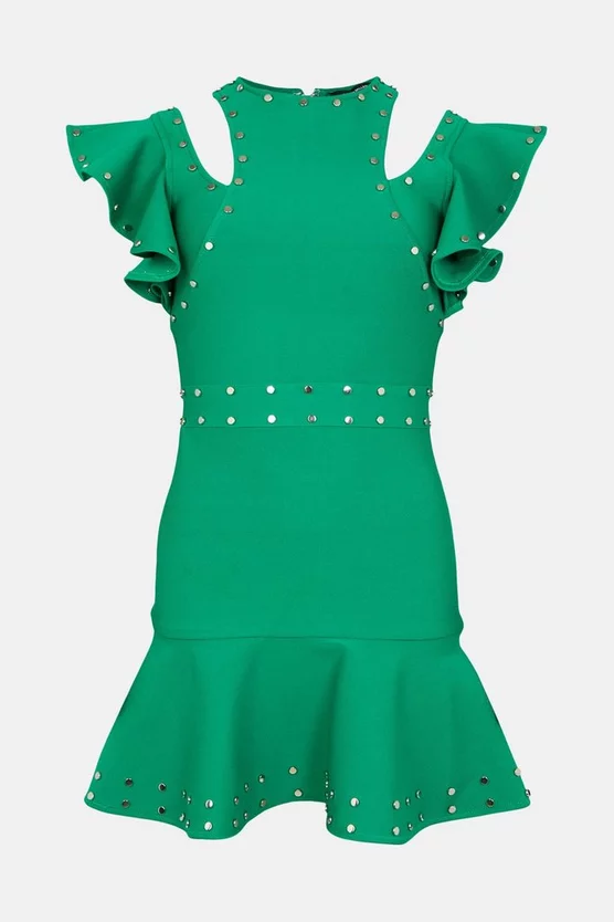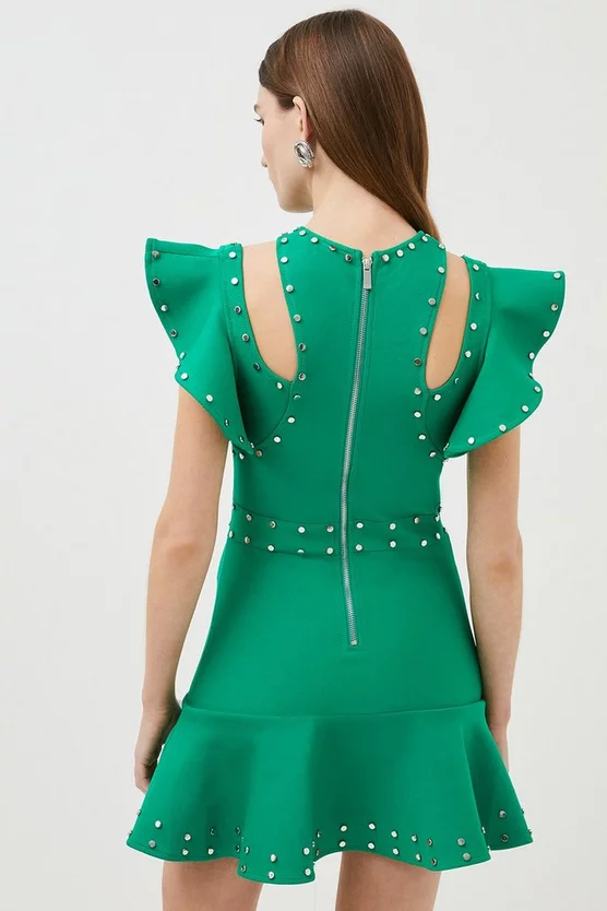 Glossy silver-tone studs lend a tough-luxe twist to this statement mini dress. Showcasing architectural frills, bold cut-outs and a flared hem, it strikes a directional style note for after-dark occasions and closes neatly with a sporty back zip.