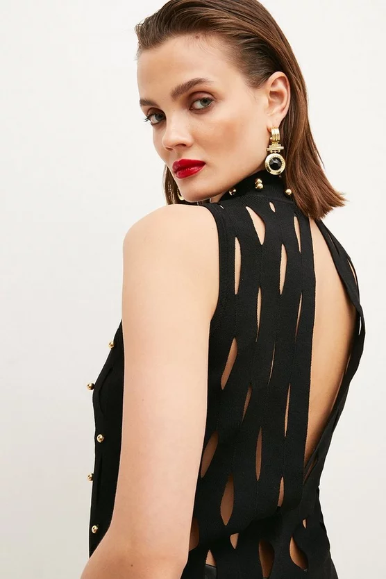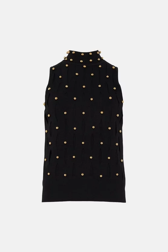 Textured cut-outs and gleaming studs bring an impactful twist to this sleek, sleeveless knit top. The perfect glamorous partner for leather trousers, spin around to show off the dramatic open back.