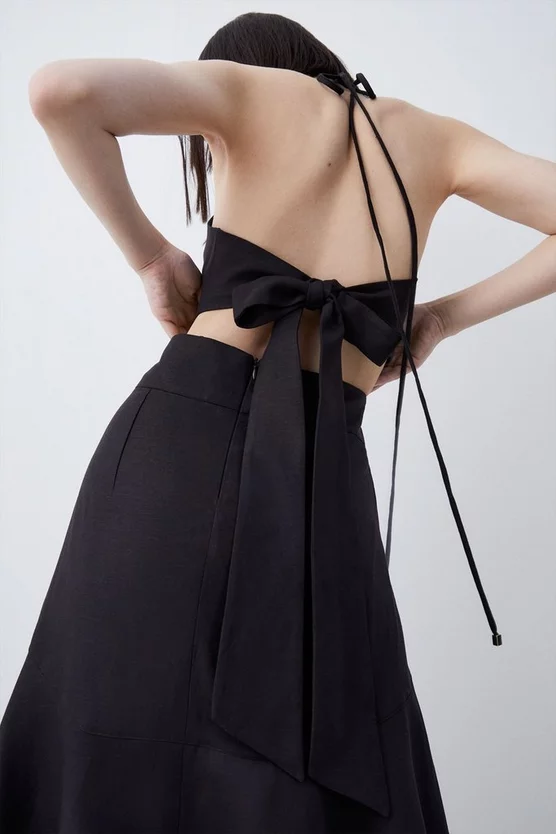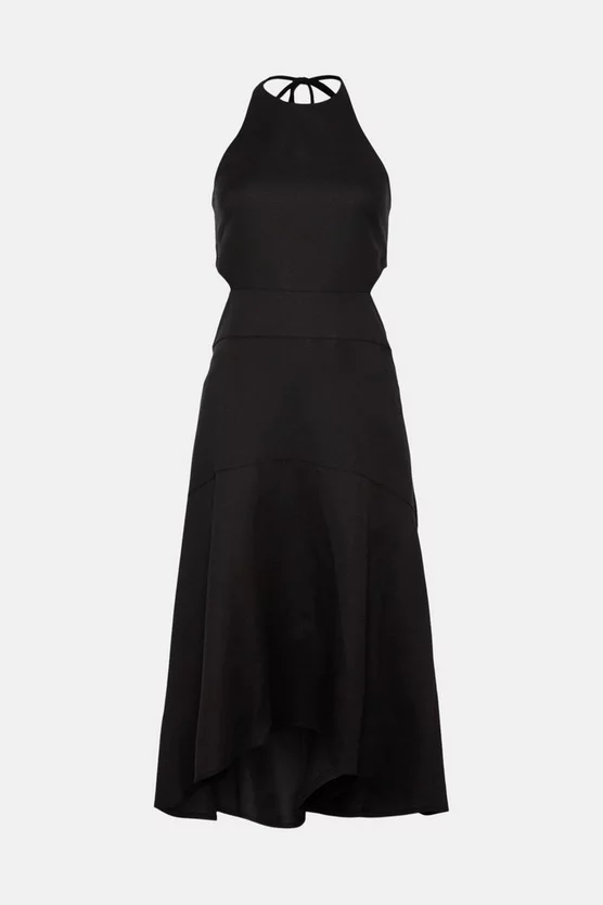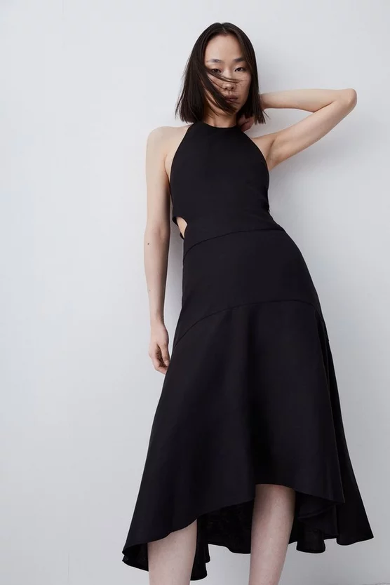 Made for the sun-drenched days of summer, this beautifully cut linen-blend dress blends modern cut-outs and slender tie straps that trail alluringly behind you. Light and breezy, the softly tailored silhouette and alluring high-low hem guarantee a polished – but suitably laid-back – finish that feels just right for sun-baked sojourns.