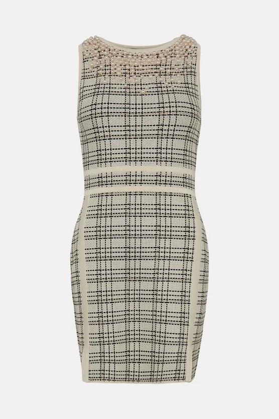 Light-catching pearls lend a unique touch to this sleek pencil dress. Cut to a simple, streamlined fit that shows off legs beautifully, this checked design blends ladylike appeal with a modern finish. Enhance the fuss-free, sleeveless fit and monochrome palette with chunky black heels and matching pearl earrings.