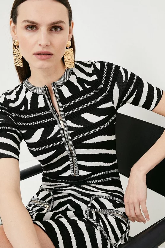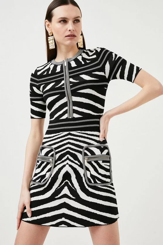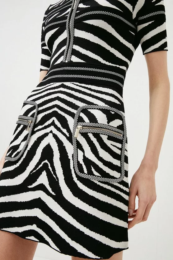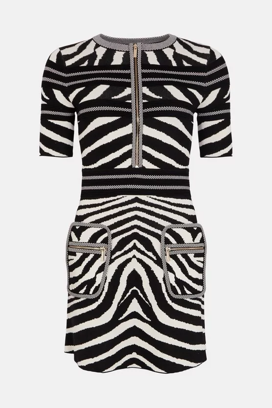 This structured knit dress features a bold zebra print with quirky micro check trim. The figure-hugging mini style has a retro vibe with it’s short exposed zip opening at the neckline and fun zipped patch pockets at the front of the hips. Bands of micro check create a styled look while contouring the body. Flaunt your individual style in this confident look.
