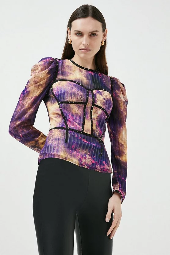 This tailored top in delicate chiffon fabric is modernised with a tie-dye print in a moody pallet of blues, purples, and black. The simple long sleeve round neck style top is elevated by bustier detailing accentuated with woven taped seams and adorned with mini studs, while draped sleeves create volume around the shoulders. Pair with fitted black trousers and bright popping accessories for a well-coordinated look.