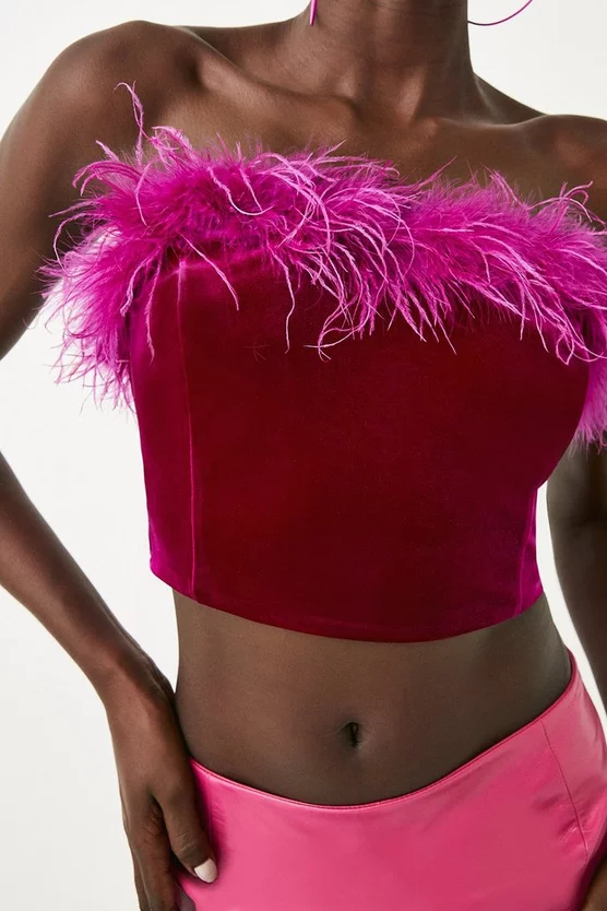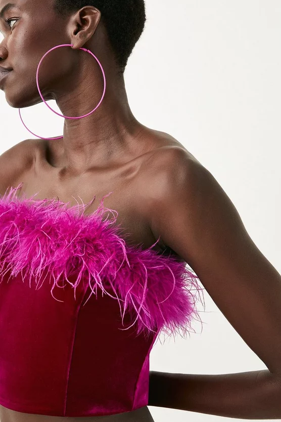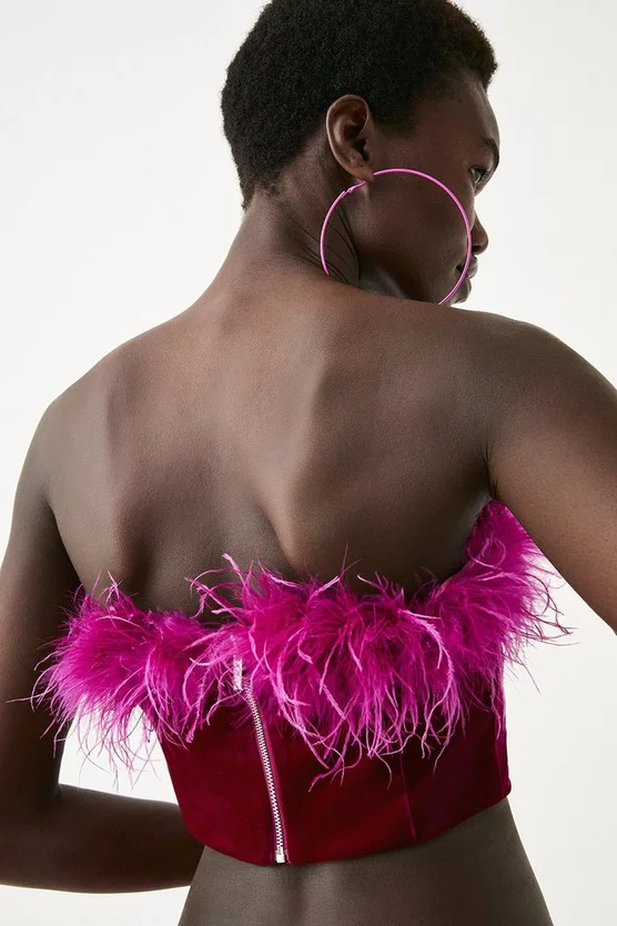 Main: 95% Polyester, 5% Elastane. Lining: 93% Polyester, 7% Elastane. Trim: Feathers. Dry clean only. Model wears UK 8/US 4. Model height: 5″9. Length measurement: 18cm.