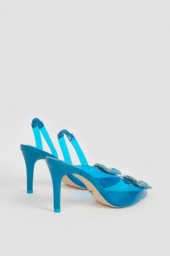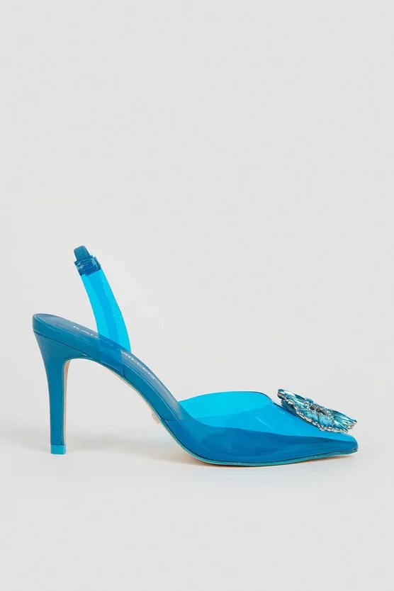 Play a seductive game of reveal and conceal in these unique slingback sandals. Crafted from flexible plastic that flashes a hint of flesh, they add endless modern allure to sharp trousers suits. Opulent crystal brooches punctuate each vamp, offsetting pointed toes, slender heels and buckle-fastened slingback straps.