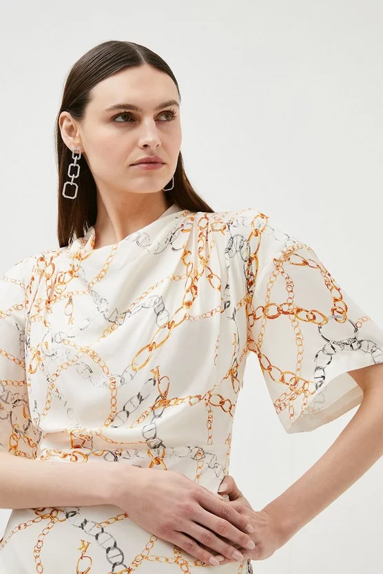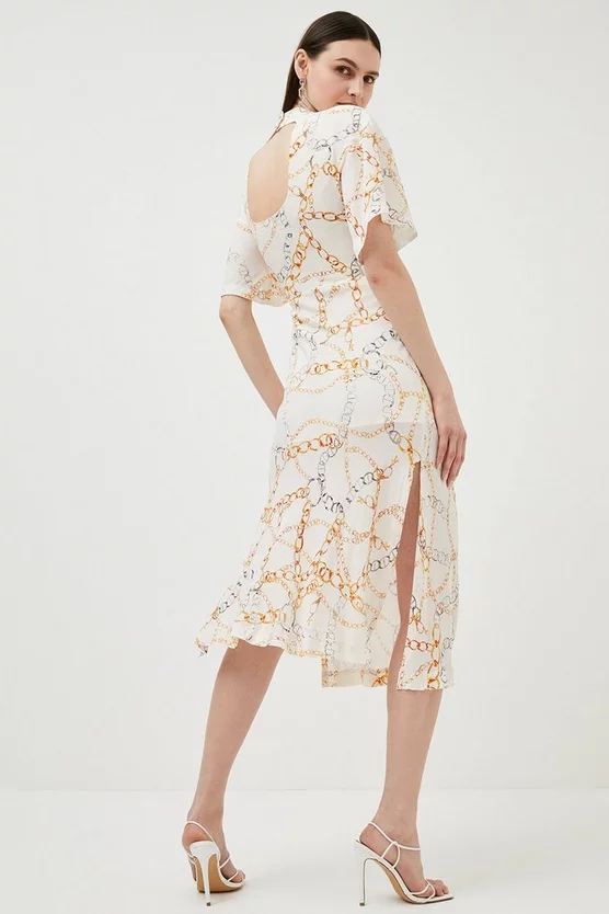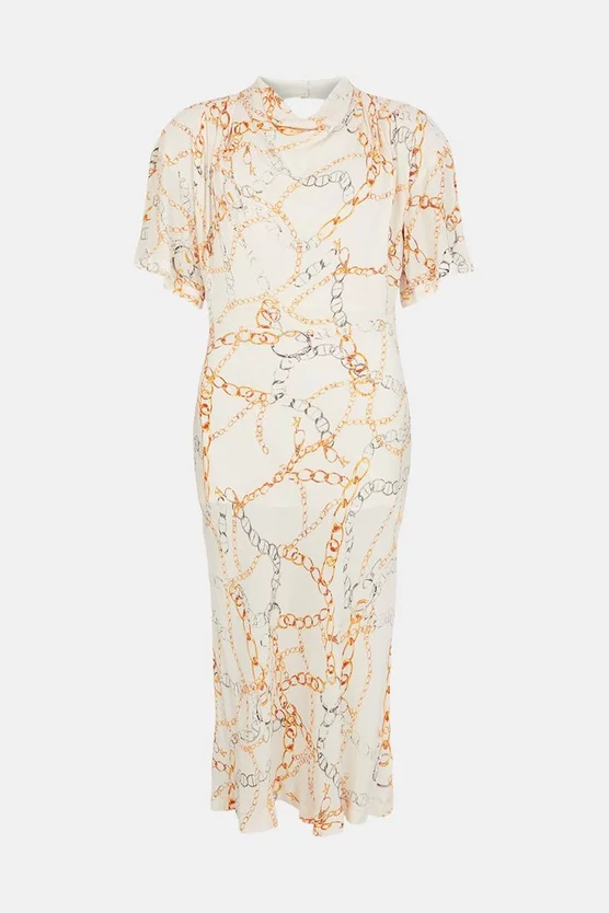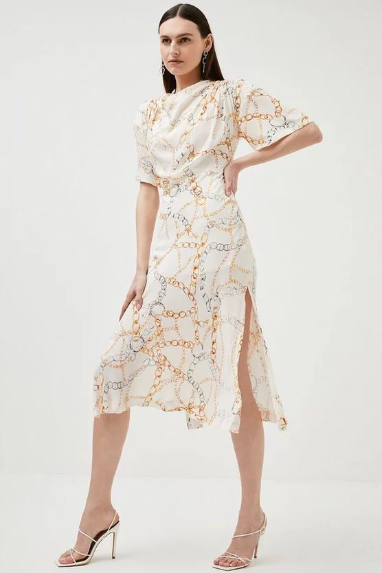 Rippling chain-print fabric is the star of the show on this slinky midi dress. Fitted with an on-trend cowl neckline, loose sleeves and a seductive hem split, it fits seamlessly into any well-curated summer wardrobe.