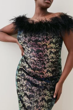 Hot Sale ๐ Karen Millen Plus Size Sequin Bardot Feather Trim Midaxi ๐ Dress – multi ๐